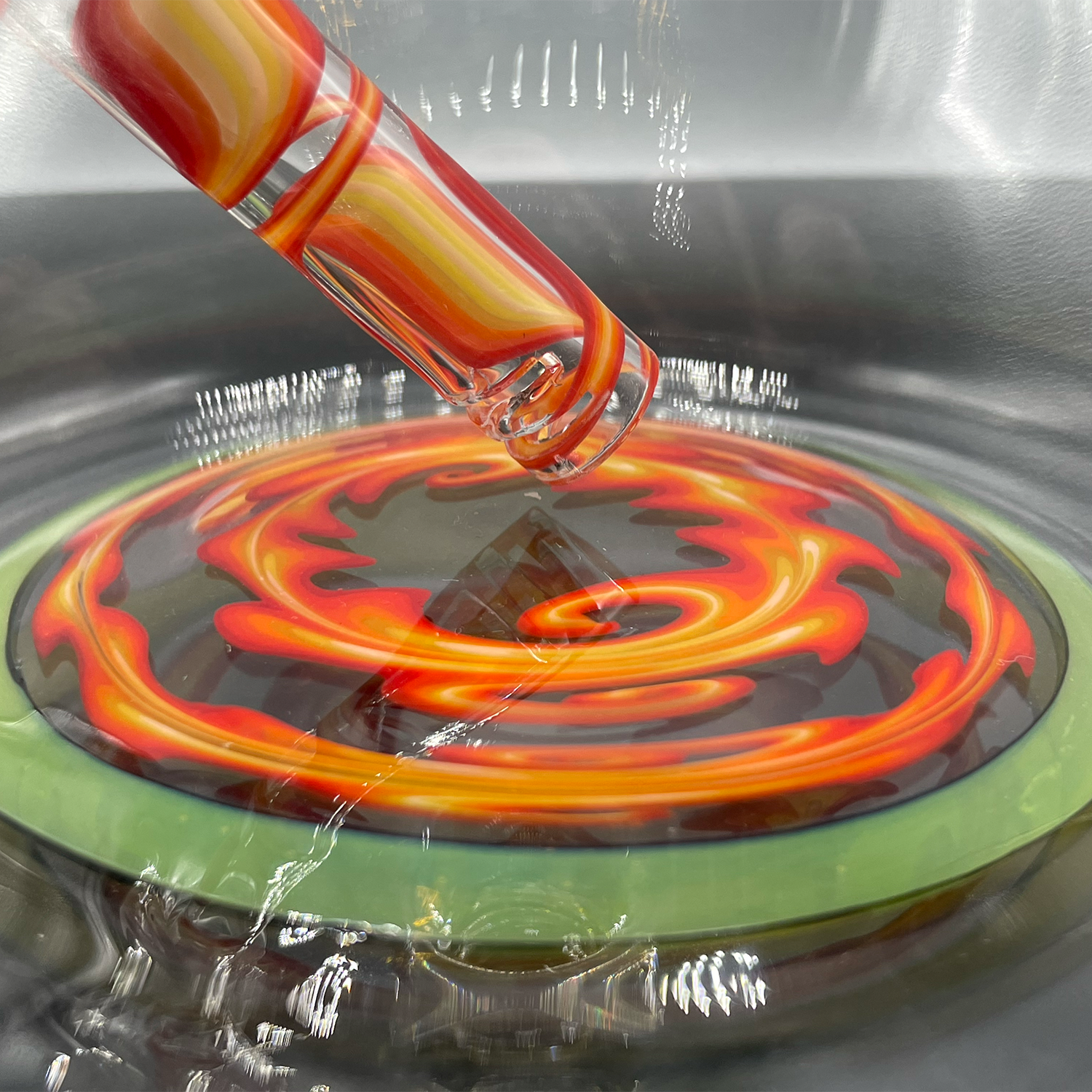 This stunning bong features a double layered neck section, accented with Greasy Glass Dense Yellow. On the base, there are four clear-to-fade wigwag sections that originated from hand-pulled tubing. Lastly, the 14mm downstem is from the same hand-pulled tubing with an open bottom and two slits above it. This piece will be shipped with a bong bag.