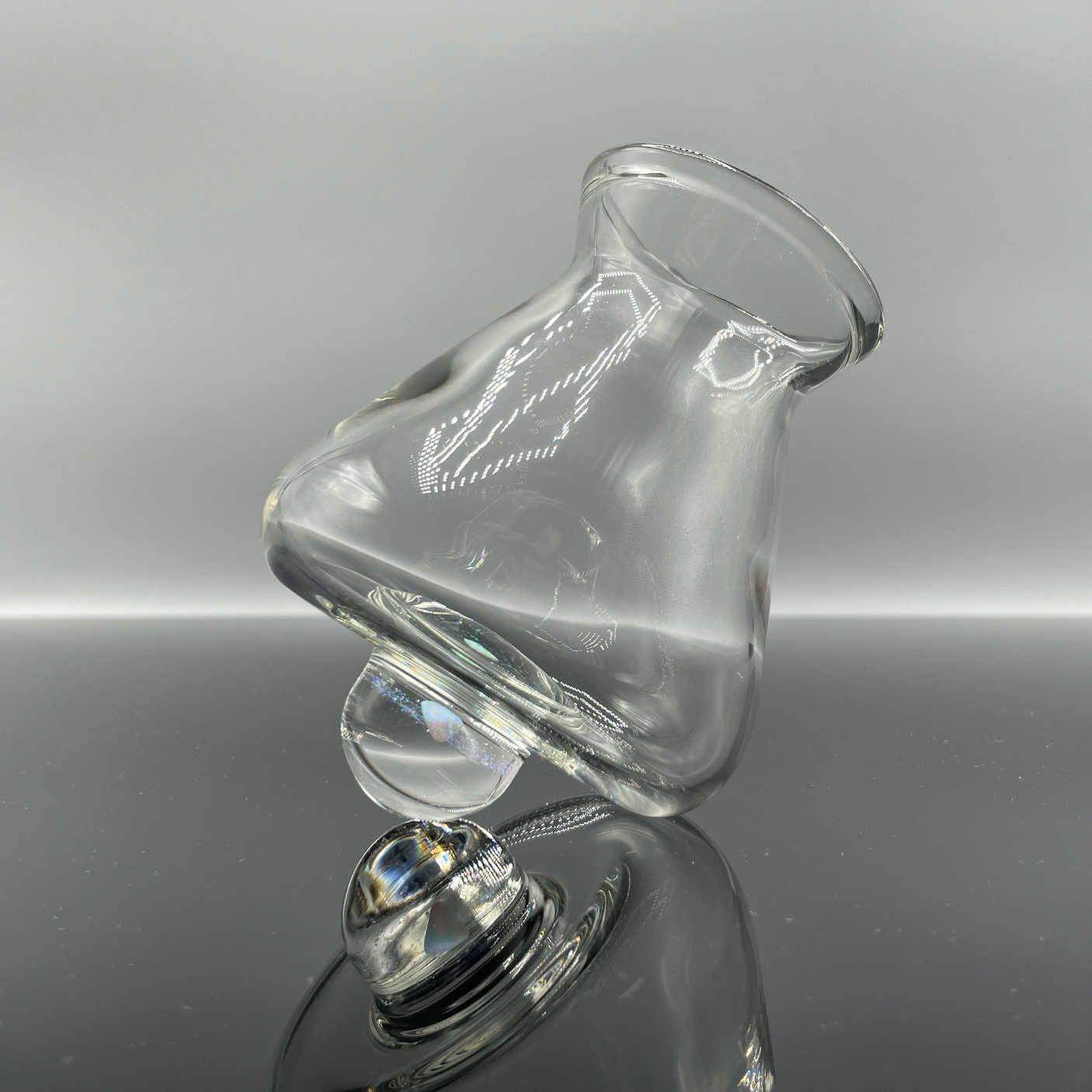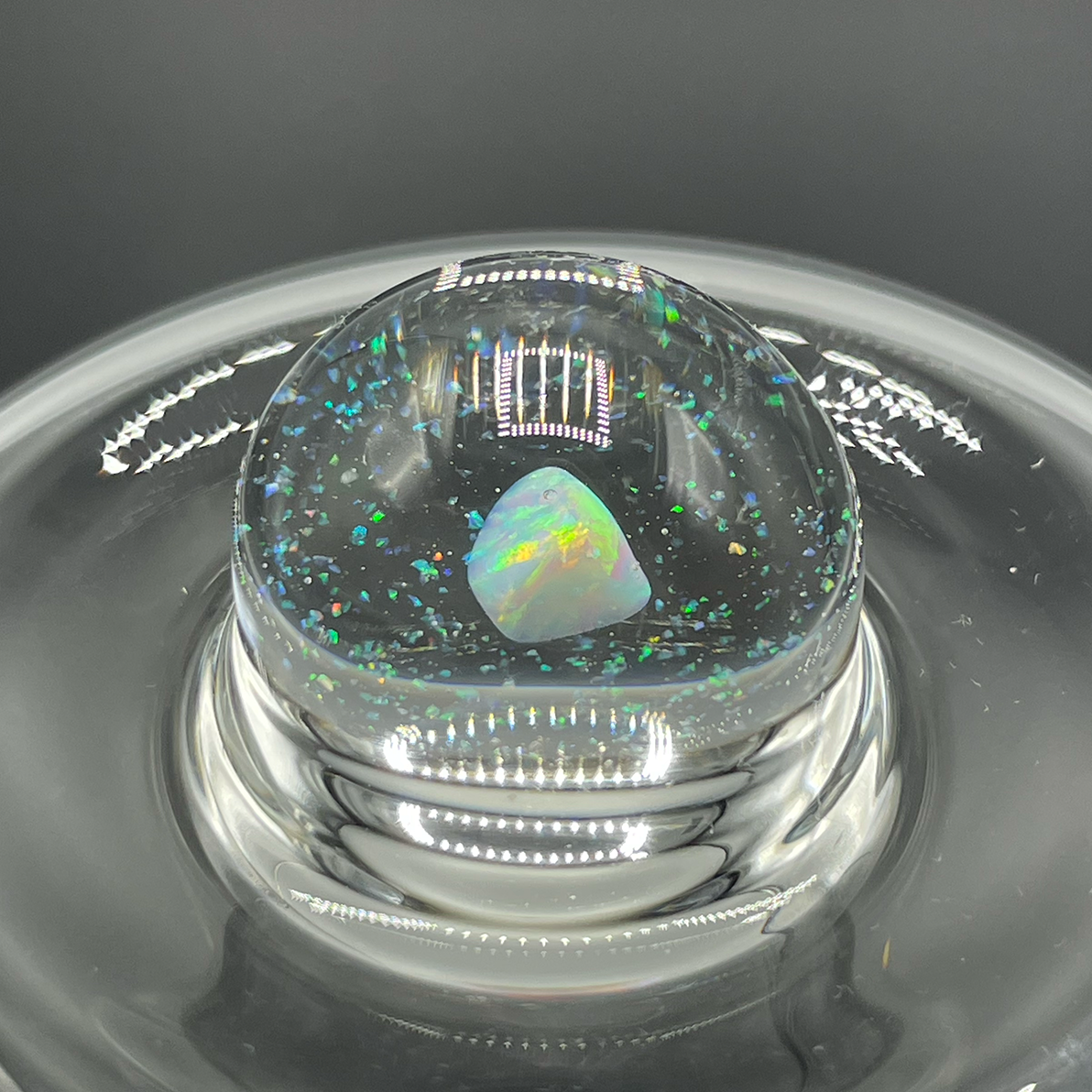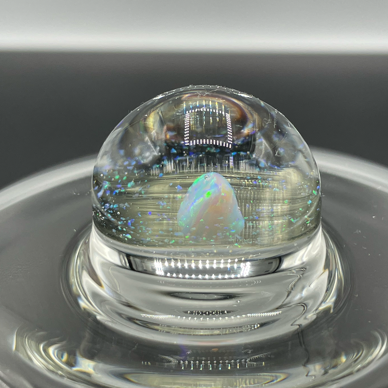 Made from borosilicate glass, the rotating glassware is perfect for aerating and enjoying your spirits. This specific glass is all clear in the shape of a glencairn whiskey glass. The glass is welded and balanced on a swiveling ball that contains crushed opal cane and a glistening white opal.